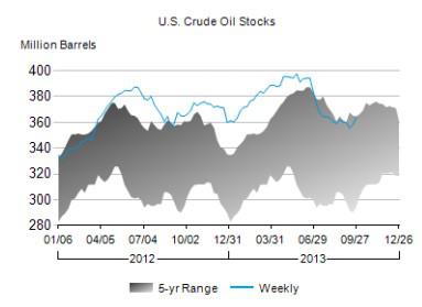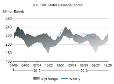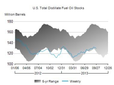 Distillates supplies, which include diesel and heating oil, dropped 1.7 million barrels (1.3%) for the third straight week of declines. Distillates demand for the last four weeks is up a seasonally adjusted 1.6%, and supplies remain "near the lower limit of the average range," according to the EIA. In the past year, distillates inventories have increased 4.1%.