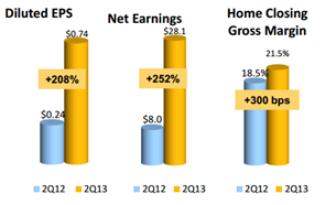Its net income grew much faster than its revenues, improving 252% to reached $28.1 million year over year. Per-share earnings rose by 208% to reach $0.74, compared to $0.24 last year. This growth in net income and EPS was driven by effective management of ongoing business expenses, a 3% improved gross margin and 55% higher home closing revenue compared to Q2 2012.