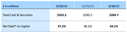 Meritage's balance sheet has also improved over time. Its cash & equivalents in June 2013 increased by 19.56% and 72.6% compared to December and June 2012, respectively. Its debt-to-capital ratio decreased by 0.9% from December 2012, and by 6.9% from June 2012, even though it added $75.4 million in debt this year. All these factors have improved the liquidity position of the company.