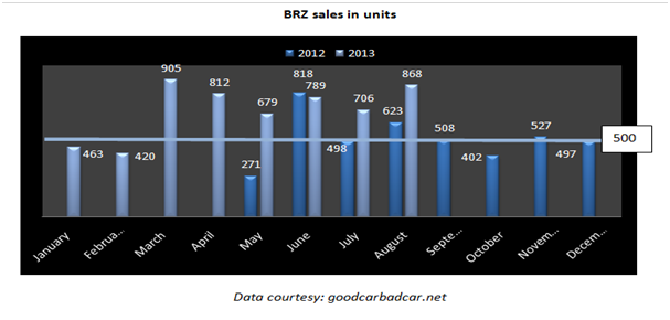 Charts show that BRZ has been an instant hit; it has seen explosive sales ever since it made its debut in the spring of last year. The car was so much in demand that the average monthly sales figure of 500 cars that Subaru initially had in mind proved way short of demand. BRZ hit dealer lots in May 2012 and immediately sold 271 cars. In June, the monthly sales figure rose to 818. Subaru sold 4,144 BRZs in 2012 and in 2013 around 5,642 BRZs have already left showrooms. Sales were up 22% for the three-month period from June to August, compared to the same period last year.