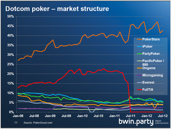 Consequently, Caesars and MGM/Boyd/bwin.party would be the two most likely companies to generate network effects and ultimately achieve PokerStars-like or Full Tilt-like (pre-July 2011) market shares, while leaving everybody else in the dust. You might recall this chart from bwin.party's 2012 First Half Results investor presentation: