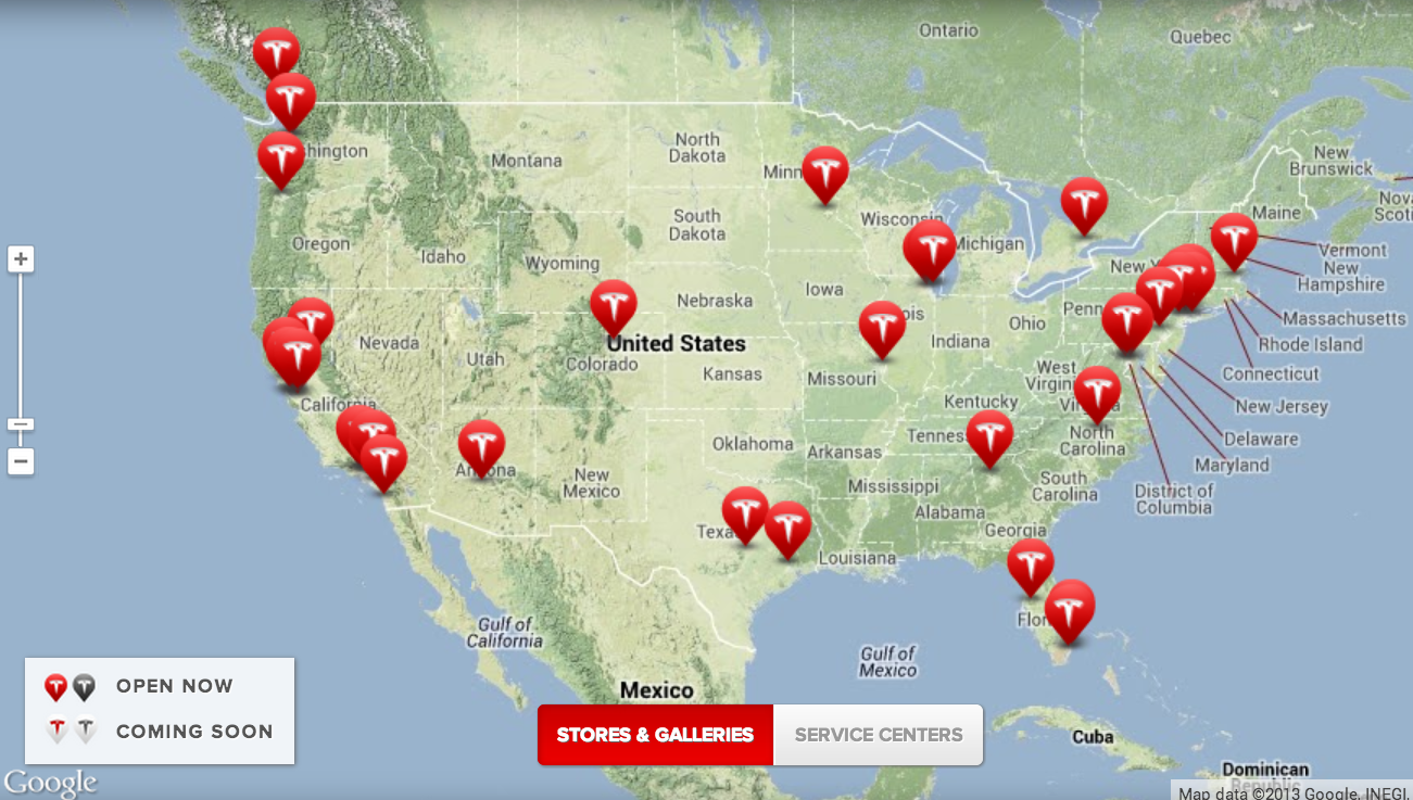 Tesla's U.S. retail store locations. Source: Tesla Motors.