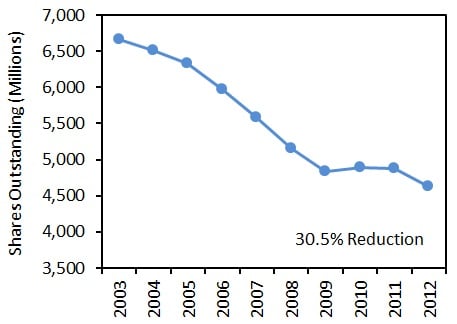 Over the past nine years, ExxonMobil's share repurchase programs have reduced shares outstanding by 30.5%. This not only has an effect of increasing EPS, but it also allows ExxonMobil to continue paying reasonable dividends even in the face of thinning margins. This partly explains why the oil behemoth has been able to increase dividends for the past 31 consecutive years.
