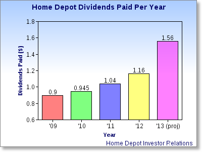 In the span between 2002 and Feb. 3, 2013, when this new program was announced, Home Depot had returned an incredible $37.5 billion of cash to its shareholders through share repurchases. This means the company had repurchased roughly 1 billion shares in a little over 10 years, almost unheard of in today's market. If Home Depot maintains its performance, I would not be surprised if the current repurchase program is replaced by an even larger one at the conclusion of fiscal 2013.