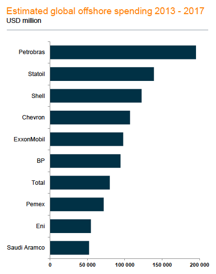 This growth, led by the development of deepwater technologies, has created opportunities that in turn have reduced costs and increased safety. Because of these reasons, it has become economical for major E&P companies to pursue these deep-water reserves. To capitalize on this trend E&P companies such as Petrobras (PBR +1.47%), Chevron, Statoil and Royal Dutch Shell have increased their presence in deepwater regions. To support their deepwater growth, these major E&P companies along with others have significantly increased their deepwater capex spending outlook over the next four years.