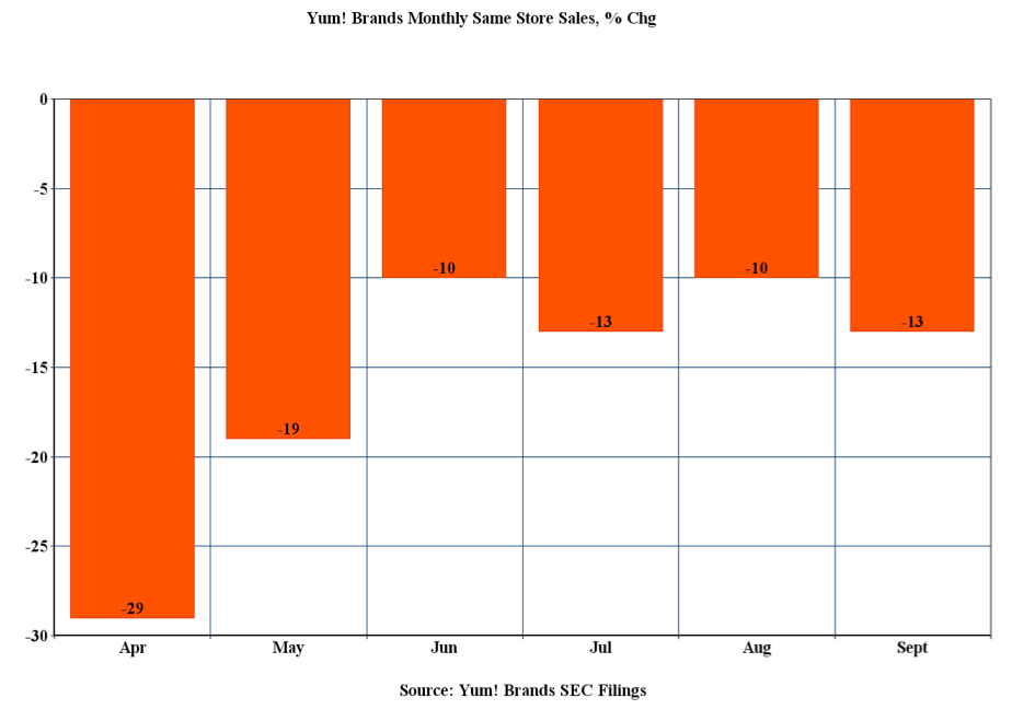 While the worst effects may have been felt early on, it's clear customers are still not returning to its stores. While Yum!'s management initially put up a brave front, saying it anticipated comps would turn positive again by year's end, it's now abandoned all pretense and says that might not happen until next year. Along with the sales drop, profits are also looking worse; full-year earnings will plunge by as much as double-digit percentages, despite its previous outlook predicting they'd only drop by mid-single digits.
