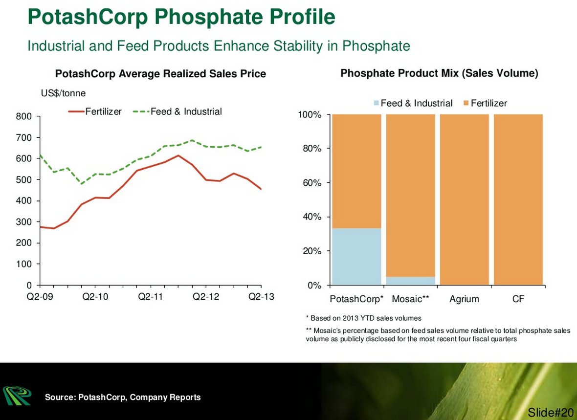 Notice how PotashCorp sells a higher volume than its rivals in the higher priced Feed & Industrial segment. It sells about a third of its volumes to that market while Mosiaic is less than 10%, while neither Agrium nor CF Industries sell into that higher priced market. Intrepid Potash, on the other hand, has no product diversity as it is a potash pure-play. It's PotashCorp's ability to capture additional cash flows like this that enable it to have the excess cash to ship back to shareholders.