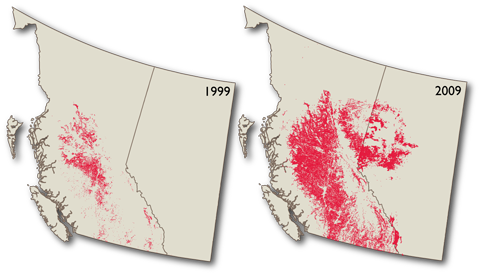 As you can see in red, the area affected increased substantially through 2009, and to my knowledge the progress hasn't slowed. Thus far, the mountain pine beetle epidemic has spread across 43 million acres, killing 710 million cubic meters of timber since the current infestation began.