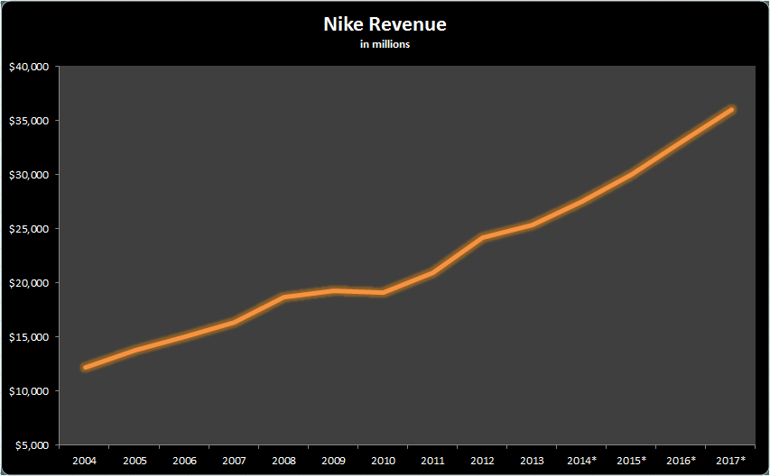 Graph by Author. Information credit: Morningstar.com. 2014-2017 projected from Nike remarks.