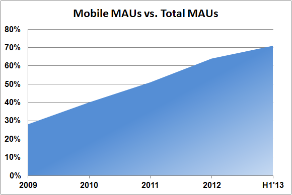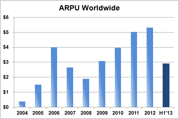 Clearly, Facebook had a bit of growing pains between 2006 and 2008 when MAUs exploded from 12 million to 145 million. Since then, it seems that Facebook worked through the kinks and has been able to scale up its marketing prowess to accommodate a much larger audience. For the first half of 2013, Facebook's APRU increased by more than 17% over the same period in 2012.