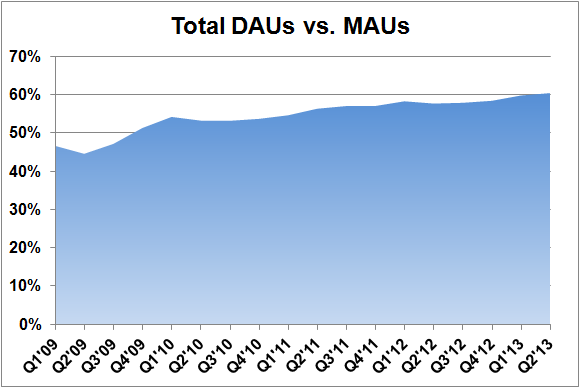 By dividing the number of daily active users, or DAUs, into the number of MAUs in a given period, investors can get a good sense if Facebook is creating a more engaged audience over time. From the investor perspective, you'll want to see this ratio growing over time since it creates more opportunities to deliver compelling ads.