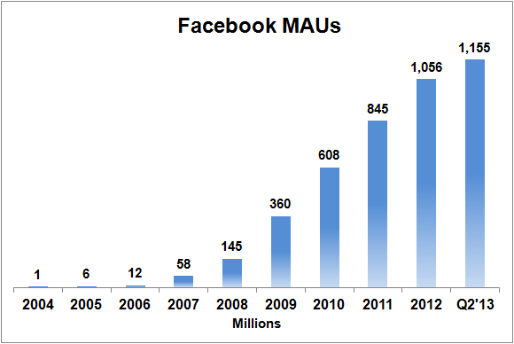By the end of 2004, Facebook had a respectable 1 million monthly active users, or MAUs, as it began expanding its reach to more colleges and universities around the U.S. With more than 1.15 billion strong today, Facebook has experienced user growth 1,154-times over that humble beginning. Simply astonishing.