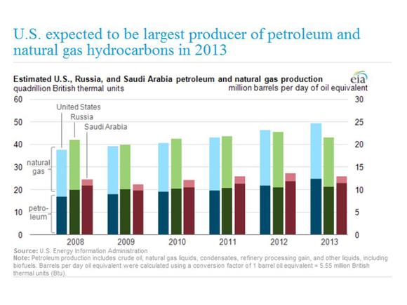 "We don't make anything anymore" is a common lament heard in the US these days. One thing we do produce is energy. New production technology opened up an ocean of shale gas. So, it's hardly a surprise that US energy production rivals Russia as #1 in the world. What may surprise some is the fact that the US is now projected to surpass Saudi Arabia as the #1 oil producer in 2013, thanks to these very same advances.