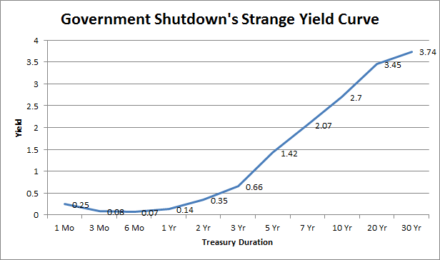 But for the time being, until there is any effort to raise the debt ceiling, the market for U.S. Treasuries will continue to favor longer-term issues over short-term T-bills. The U.S. Treasury is the "bank" for companies with billions of dollars they want to keep liquid. Until the debt ceiling is raised, Treasury securities are no longer a good place to store cash balances. And as you can tell from the yield curve, there are clear concerns that the government may allow itself to default.