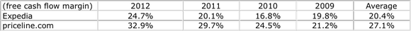 From a free cash flow perspective, we see something rather remarkable. Despite increased competition, both companies have rather attractive margins, while showing a steady increase in their ability to generate cash. For instance, Expedia has grown its free cash flow margin from 19.8% in 2009 to 24.7% in 2012 (a 24.7% increase). Likewise, priceline.com has seen its free cash flow increase from 21.2% in 2009 to 32.9% in 2012 (a 55.2% increase). Although both metrics are attractive, it would appear that priceline.com does, indeed, have a competitive edge, but it should be noted that Expedia is right on its coattails.