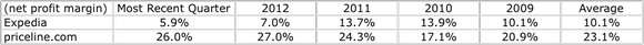 In a company in which most of its business is service oriented and in which there are little to no physical assets, threat of competition could serve to impair a company's future performance, thereby justifying a severe decline in share price (think AOL or, from a private company perspective, MySpace). But, with a company whose revenue has increased by 36.4% over the past four fiscal years, is there a possibility that the market is overreacting to its downgrade? In an attempt to answer this, let's begin by comparing its main competitor; priceline.com (PCLN 0.05%).