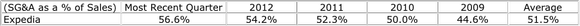 As shown in the table above, Expedia has demonstrated a consistent decline in its net profit margin, while priceline.com has demonstrated pretty much the exact opposite. This news shouldn't bode well for shareholders of Expedia but, at the same time, investors should understand the origin of the company's declining net profit margin before they render a buy or sell judgment. Upon further analysis, it becomes clear that the company's primary driver for decreased profitability has been an increase in its selling, general and administrative (SG&A) expenses as a percentage of sales.