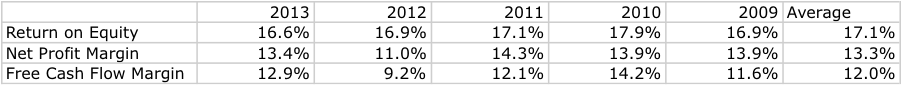 Starting with the company's net profit margin, we see an almost annual decline from 17.5% in 2009 to 13.4% in 2013. Although a net profit margin above 10% could generally be considered attractive, the trajectory of Procter & Gamble's margin suggests that it may soon dip below this level. However, upon further examination, I found that the company's margins aren't necessarily decreasing from the historical average. Rather, they appear to be reverting to the mean.