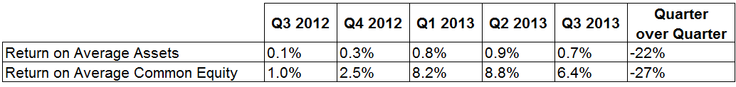 Citigroup was off to a strong start in 2013, with two consecutive quarters of return on average common equity above 8% after two straight quarters where it was below 2.5%. It also saw improving return on average assets through the first six months of 2013, after a paltry final six months of 2012. However, things took a turn for the worse in the third quarter, and both return on average common equity and return on average common assets fell by almost a quarter: