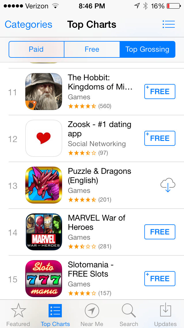 The big winner from Japanese consumers flocking to the smartphone platform with disproportionately high spending on apps has been GungHo Entertainment, the maker of the game Puzzles & Dragons. The game is a mix of an RPG on the top half of the screen, and a puzzle game similar to Bejeweled on the bottom.