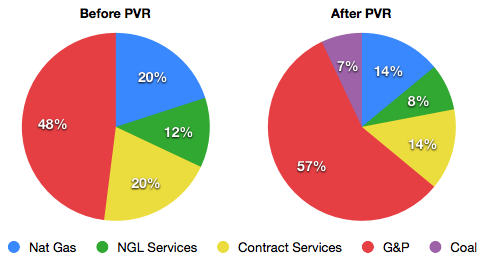 Though Regency will gain diversity from an earnings perspective by picking up PVR's coal royalty business, after the acquisition more than 50% of its earnings will be derived from gathering and processing services: