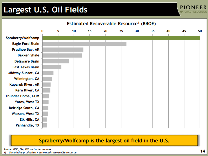 According to early estimates provided by Pioneer Natural Resources (PXD +0.00%), the Spraberry Wolfcamp shale play near Midland, Texas could be the largest oil field in the country and the second largest oil find in the world. The company estimates that the play contains 50 billion barrels of recoverable oil. Only the infamous Ghawar oil field of Saudi Arabia is larger.