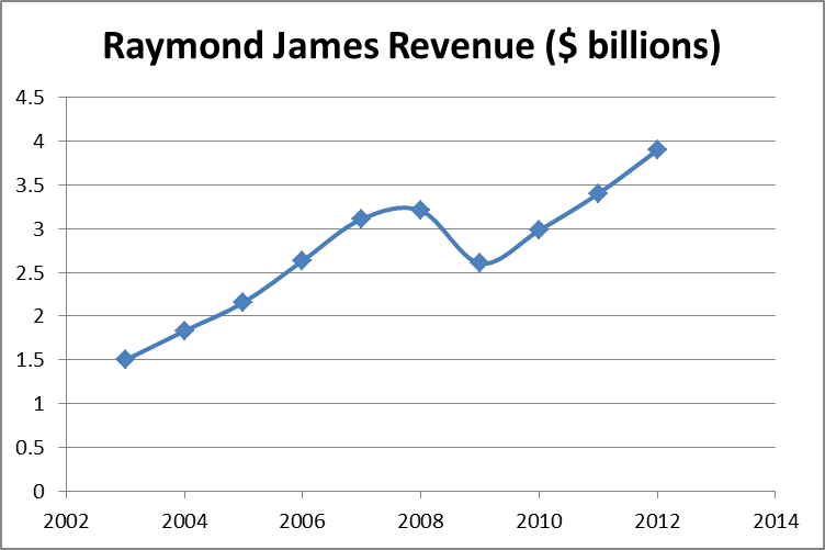 Raymond James is a good play on the benefits of the improving economy because it is one of the most ambitious companies in the sector in terms of growth plans, and it seems to be succeeding admirably. The Morgan Keegan acquisition will accelerate its growth, but bear in mind that the almost linear growth in the chart above was before the acquisition, and it just represents the organic growth of the company.