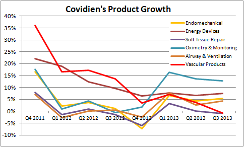 First, unlike rivals like Johnson & Johnson (JNJ +0.75%) or General Electric's (GE +3.95%) health care division, Covidien doesn't have many large-ticket capital machinery type items. Instead, its solutions tend to come at more accessible price points -- a key plus point when trying to expand EM sales. Moreover, Covidien claims that its emerging market margins are higher than the company average, so there is a margin expansion opportunity as well. Furthermore, with no product (or class of product) contributing more that 5% of total sales, it isn't reliant on any one item for its sales growth.