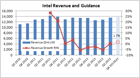 Despite the fall in earnings this year, the stock still trades on a P/E ratio of 12.7 times earnings for 2013, and a dividend yield of nearly 4%. In other words, the valuation is so cheap that Intel can afford to make the odd hiccup from quarter to quarter. Moreover its near 60% gross margins and substantive free cash flow generation (approaching $9 billion on a trailing basis) mean that it can buy its way into the new device market. The company may not be firing on all cylinders, but the valuation provides for plenty of upside if/when it starts achieving its aims.