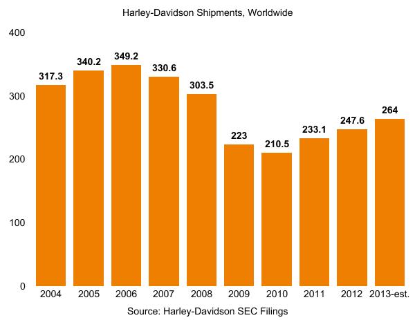 Harley's been riding high in recent years, as sales of its iconic bikes recover from the crash of the recession. After peaking at almost 350,000 bikes shipped worldwide in 2006, shipments plunged 40% as the financial crisis gripped the country. They've only just begun to recover, with shipments reporting their first gains in 2011, running 10% higher than the year before, but already they're beginning to stall.