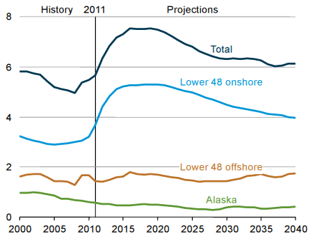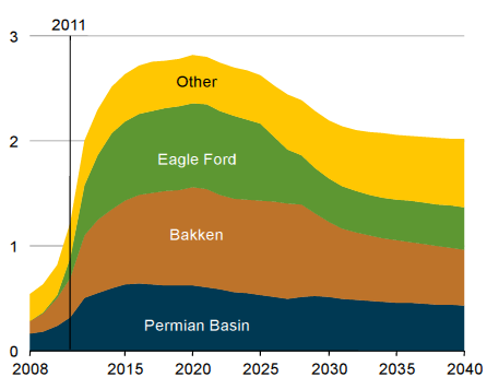 Tight oil production is estimated to reach 2.8 Mmbbls/d in 2020 and then drop to about 2 Mmbbls/d in 2040, with the expected depletion of sweet spots. However, about 25.3 billion barrels of tight oil are expected to be produced cumulatively from 2012 through 2040, which makes this unconventional resource account for about 33% of total U.S. oil production.