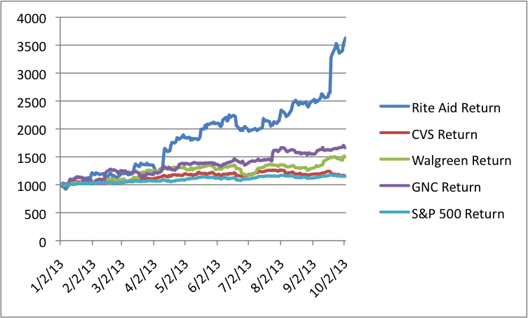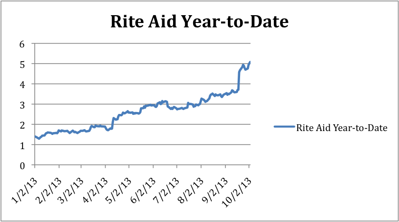 This graph measures the year-to-date performance of Rite Aid, CVS Caremark (CVS +0.46%), and Walgreen Company (WAG +0.00%). We can see that each company has performed well, but that that Rite Aid appears to have left the competition in the dust.