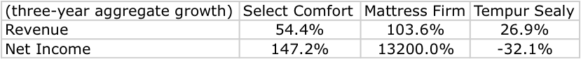 Over the past three years, all three mattress manufacturers have seen attractive growth. You can see this in the table below: