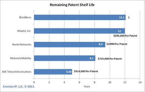 BlackBerry's patent portfolio was ranked 82nd in the U.S. top 100 patent portfolios by Intellectual Asset Management Magazine. It was also identified as one of 14 companies with "stand-out" portfolios. Its patents have a lifespan of roughly 12.1 years, much higher than Nortel's (NYSE: NT) 9.4 years and Motorola's 8.1 years. While there is no fixed market price for BlackBerry's patents, several investment banks have valued it between $2.25 billion-$5 billion. BlackBerry's 7,500 patents and 4,200 granted ones would give the buyer a huge competitive advantage in the current smartphone market.