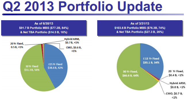 Last quarter, American Capital Agency's portfolio managers derisked its underlying portfolio by reducing its positions in 30-year mortgages to add to its 15-year mortgages. Its earnings supplement revealed that it cut its holdings of 30-year mortgages by 8 percentage points, adding that capital to its position in 15-year mortgages.