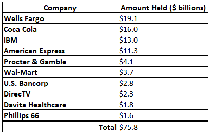 At the end of the second quarter, Berkshire Hathaway had a little more than $75 billion dollars invested in its 10 biggest stock holdings, which are broken out in the chart below: