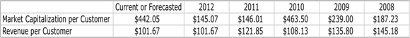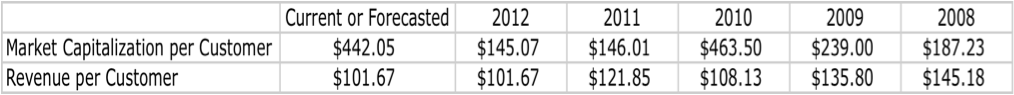 Since 2012 though, the company's price has risen dramatically once again. Although it's still below its cost when pitted against its 2010 fiscal year, the $442.05 that an investor pays for a subscriber compared to the $101.67 in revenue that said subscriber will bring to the table for 2013 (assuming that for the company's 2013 revenue are accurate and assuming that steady subscriber growth continues) is very high. By dividing the $442.05 by the $101.67, you arrive at a ratio of 4.43, which is the number of dollars you are willing to pay for each dollar a subscriber will bring in. Although this is high compared to historical norms, it is far lower than the 7.38 ratio given by Sirius XM Radio and significantly lower than the 11.64 ratio given by Pandora Media.