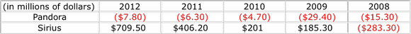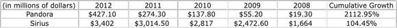 Over the past five years, Pandora has been able to significantly outpace Sirius in terms of growth, seeing its revenue grow from $19.3 million in 2008 to $427.1 million by the end of 2012. This represents a more than 2,100% increase in revenue over time. In juxtaposition, Sirius has seen its revenue increase significantly as well, rising by more than 104% from $1.66 billion to $3.4 billion.
