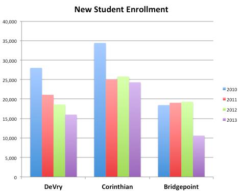 Though Apollo may be an easy target for critics, this is a trend seen at many of the other large for-profit colleges in the United States. Take a look at new-student enrollment figures from other major players like Corinthian Colleges (NASDAQ: COCO), DeVry (DV +0.87%), and Bridgepoint Education (BPI +150.00%).
