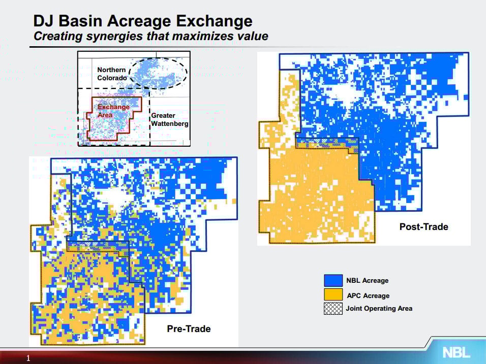 Anadarko Petroleum (APC +0.00%) and Noble Energy (NBL +0.00%) made a really great trade this week, exchanging 50,000 net acres in the greater Wattenberg area of Colorado. This is a deal that just makes so much sense for both companies.