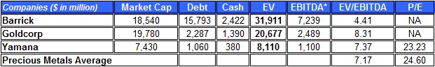 The table shows that Barrick's valuation is lower than the precious metals market average; Goldcorp's valuation is slightly higher than the market average but not far off. This makes Barrick the least expensive. In comparison, Yamana is close to the market average with a ratio of 7.37.
