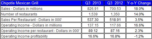 Chipotle increased its revenues by 18% in the third quarter. A close examination reveals that most of the growth in revenue was related to the rising number of restaurants, which increased by 14%. Conversely, Chipotle's sales per restaurant rose by only 3.5%. In terms of profit, the company's operating profit grew by 16.6%, while its average restaurant's profit increased by only 2.3% during the third quarter. The table below summarizes this data.