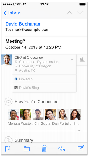 With LinkedIn Intro, users can see LinkedIn profile info about an email sender, including the sender's profile picture, where he's based, and what he does. For example, in the LinkedIn image below, users can see that David Buchanan is the CEO of Crosswise. By tapping on the name bar, users can get more detailed information on David, including past occupations, education, and mutual connections.