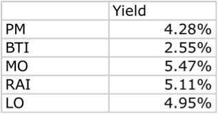 With a market capitalization of $72.8 billion, Altria's the second largest publicly traded tobacco company in the United States and the third largest in the world, sitting behind Philip Morris International (PM +0.36%), and British American Tobacco (BTI +0.35%). However, it is distinct from these players in the respect that it yields an impressive 5.47% per year. To put it in perspective, look at the table below, which shows the yields of some of the big cigarette producers in the industry.