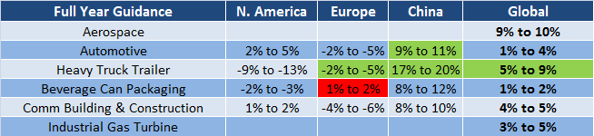 Investors tend to closely follow results from aluminum producer Alcoa (AA +0.00%) because they give great color on industrial trends in the global economy. Here's Alcoa's current end market outlook; the cells in green represent where Alcoa upgraded expectations, and those in red are for downgrades.