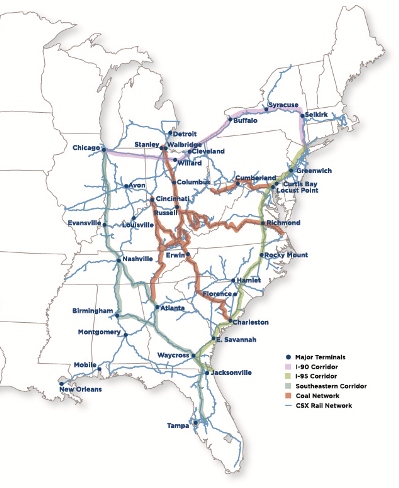 CSX (CSX +0.96%) is a rail and intermodal corporation that provides rail-based transportation services including traditional rail service and the transport of intermodal containers and trailers in the eastern U.S. Its 21,000-mile route crosses 23 states, connecting every major metropolitan area in the U.S. and two eastern Canadian provinces, and has access to more than 70 port terminals and 36 yards. CSX operates 1,350 daily freight trains, transporting an average of 20,000 carloads per day.