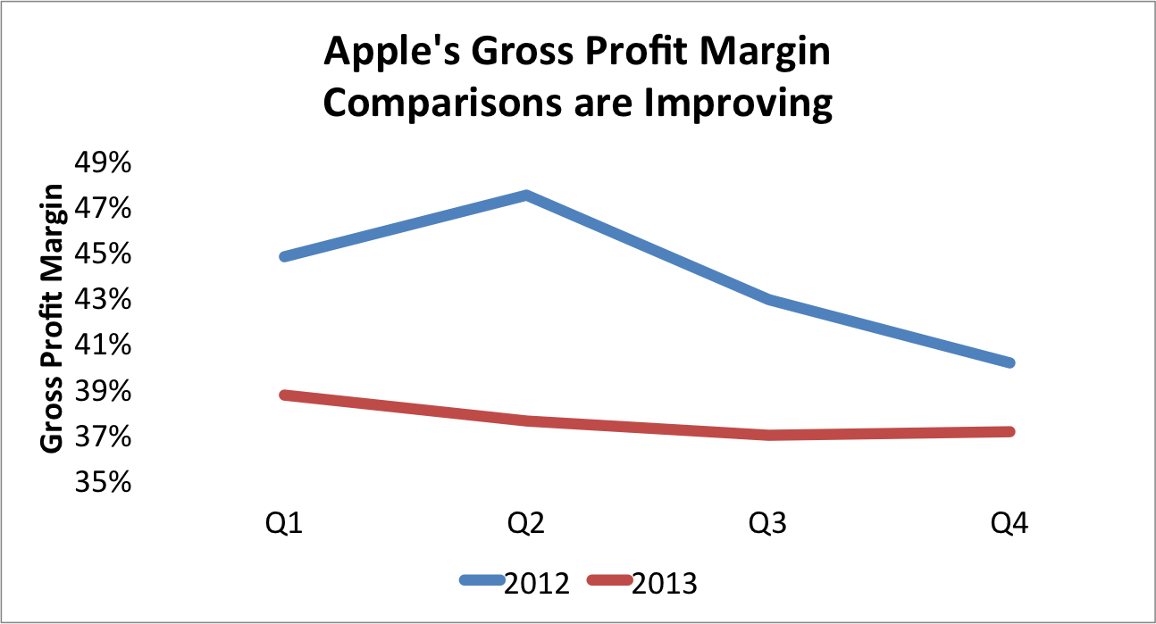 The gap between last year's gross profit margins and this year's continued to narrow this quarter, making EPS growth more feasible in fiscal 2014. Going forward, this trend looks like it will continue. Apple guided (all references to Apple's gross margin guidance are using midpoints) for 37% gross margin, narrowing the gap from the year-ago quarter to 160 basis points, from last quarter's gap of 300 basis points. Even more, if you adjust the guidance for Apple's changes to the way it defers revenue next quarter, the gap is actually closer to 100 basis points.