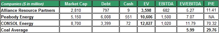 Despite the sharp drop in the prices of leading coal companies such as Peabody and CONSOL Energy in the past year, the valuations of these companies remained high. The table below shows the enterprise-to-EBITDA of these coal companies and the coal market average.