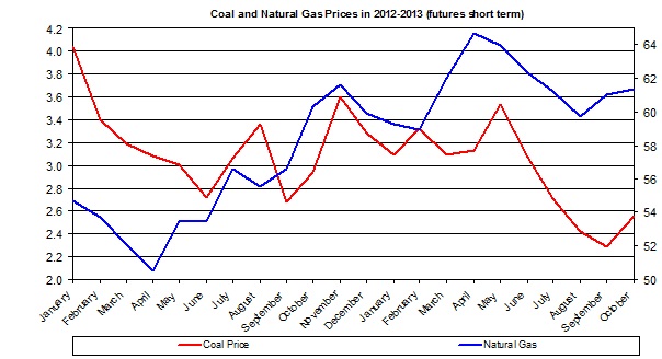 The chart above shows the rise in natural gas prices and decline in coal prices, which could partly explain the 9.6% rise in coal consumption in the first half of 2013 and the 16% drop in natural gas consumption in the power sector.