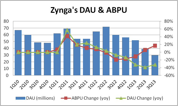 ABPU has begun its rebound this year, which is vital to Zynga's survival. But it comes as DAUs tank. That's not a good trade-off, but if Zynga can pull off its mobile transition and launch a new series of strong games, the company could face a much brighter future.